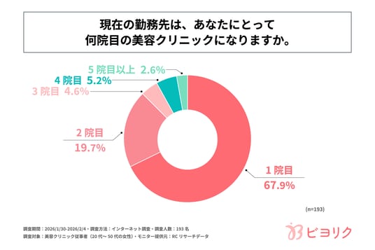 まず、「現在の勤務先は、自身にとって何院目の美容クリニックになるか」を尋ねる設問への回答では、1位が「1院目」で67.9%、2位が「2院目」で19.7%、3位が「4院目」で5.2%、4位が「3院目」で4.6%、5位が「5院目以上」で2.6%という結果になりました。「1院目」という回答が最多である一方、2位~5位の各回答の比率を合計すると32.1%となり、この結果から、美容クリニック従事者の約3人に1人が、2院以上の美容クリニックで勤務経験があることがわかりました。