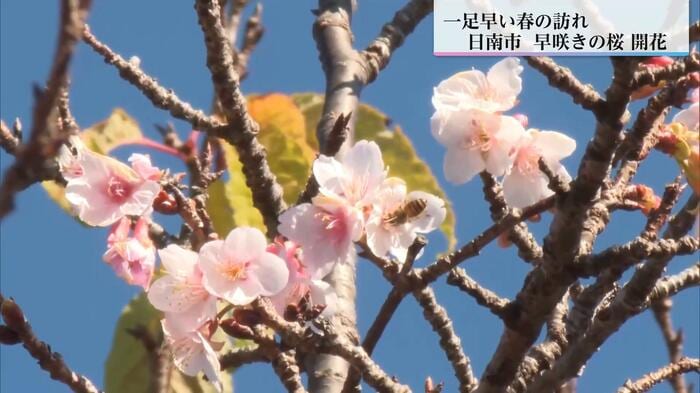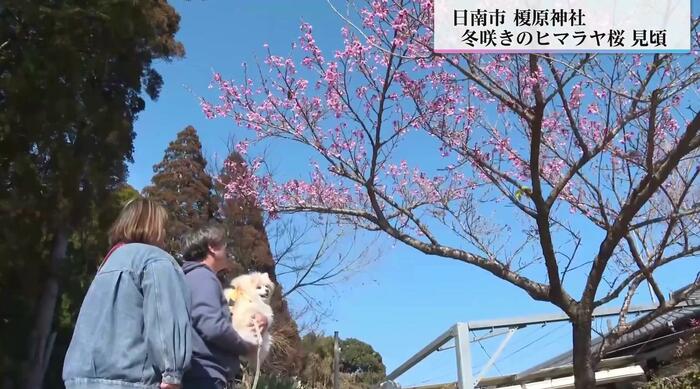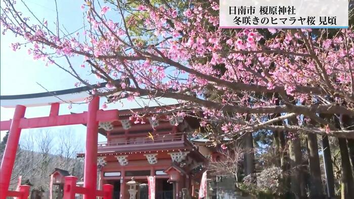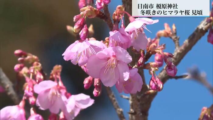 南郷町の榎原(よわら)神社では、ヒマラヤ桜が1月中旬から咲き始めた。