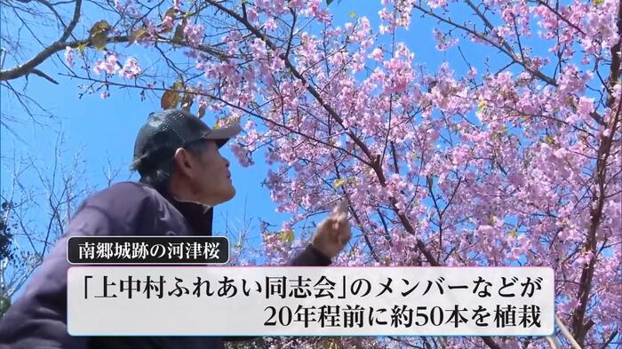 この河津桜は、地元の「上中村ふれあい同志会」のメンバーなどが20年ほど前に約50本を植栽し、現在も草刈りなどの手入れを続けている。