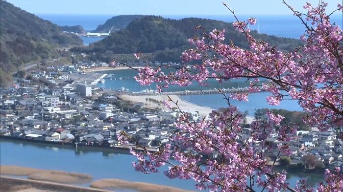 南郷町の海岸近くにある南郷城跡では、早咲きの「河津桜」が1月下旬から咲き始めた。