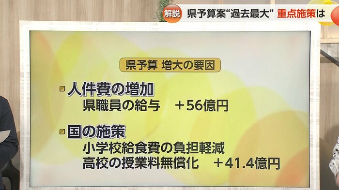 新年度予算案が過去最大となった背景には、複数の要因がある。まず県職員の給与分は今年度と比べて約56億円の増加となっている。さらに、国の施策である小学校給食費の負担軽減や高校の授業料無償化で合わせて41億円余りが計上された。