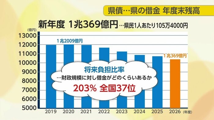一方、県の借金にあたる県債残高にも注視する必要がある。来年度末の県債残高の見込み額は1兆369億円で、ここ数年は減少傾向にあるものの、県民一人当たりでは105万円と決して楽観視できない状況にある。