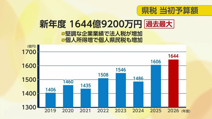 歳入面では、「堅調な企業業績による法人税の増加」や「個人所得の増加による個人県民税の増収」などにより過去最大を見込んでいる。