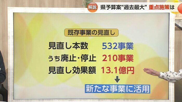 過去最大規模の予算編成にあたり、県は532の事業を見直し、うち210の事業を廃止した。見直しによる効果は13.1億円に達し、これらを新規事業に充てたとしている。