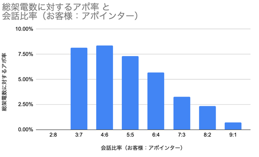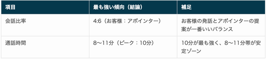今回の分析では、成果の傾向が分かれた観点として、主に以下を扱っています。・会話比率(お客様:アポインター)の違いによる成果傾向