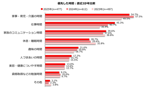 1.2025年に優先した時間「家事・育児・介護の時間」54.7%/3か年比較