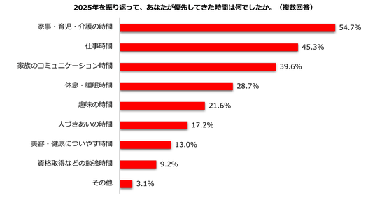 選択項目ごとに、「2026年に優先したいと願う時間」の比率から「2025年に優先した時間」の比率を引いて算出した、2026年に優先したい時間『願望ギャップ』は、「趣味の時間」が最も大きく18.0pts。「趣味の時間」は2025年に優先した時間としても3位に入りましたが、2026年に優先したいと考えている人の比率はもっと多くなっています。願望ギャップの2位は「美容・健康についやす時間」、3位は「休息・睡眠時間」と生活を充実したものにするために時間を使いたいと考える人が増えている様子がうかがえます。およそ3年続いたコロナ禍中は、外出自粛など抑圧的な生活を余儀なくされました。アフターコロナとなった2025年も、「家事・育児・介護の時間」 を優先した働くママたちが最も多くなっています。2026年は、時間を日々の生活をより豊かにするための大切な資源と捉える傾向がより強まるのかもしれません。