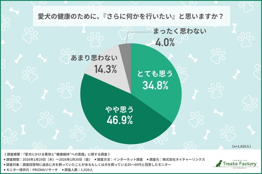 続いて、「愛犬の健康のために、『さらに何かを行いたい』と思うか」と尋ねたところ、約8割が『とても思う(34.8%)』『やや思う(46.9%)』と回答しました。