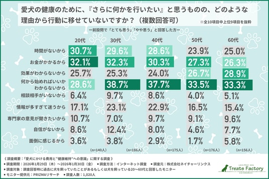 前の質問で『とても思う』『やや思う』と回答した方に、「愛犬の健康のために、『さらに何かを行いたい』と思うものの、どのような理由から行動に移せていないのか」と尋ねたところ、年代別で以下のような回答結果になりました。