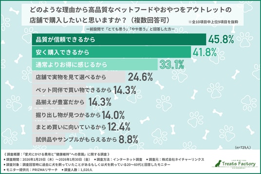 そこで、物価高騰が続く中、高品質なフードをアウトレットの店舗で購入することに対して約7割が関心を示し、その理由として「安さ」以上に「品質への信頼」が重視されていました。