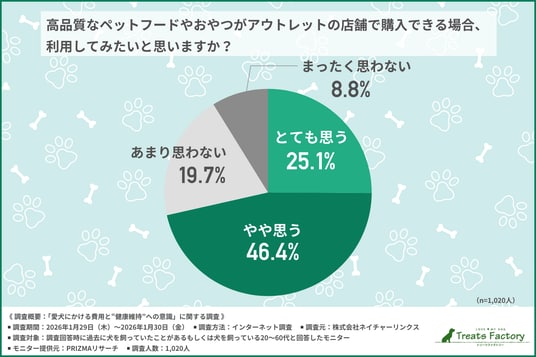 「高品質なペットフードやおやつがアウトレットの店舗で購入できる場合、利用してみたいと思うか」と尋ねたところ、約7割が『とても思う(25.1%)』『やや思う(46.4%)』と回答しました。