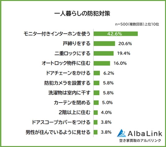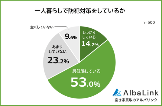 今回、株式会社AlbaLink( https://albalink.co.jp/ )が運営する訳あり物件買取ナビ( https://albalink.co.jp/realestate/ )は、一人暮らしの500人を対象に「一人暮らしの防犯」についてアンケート調査を実施しました。