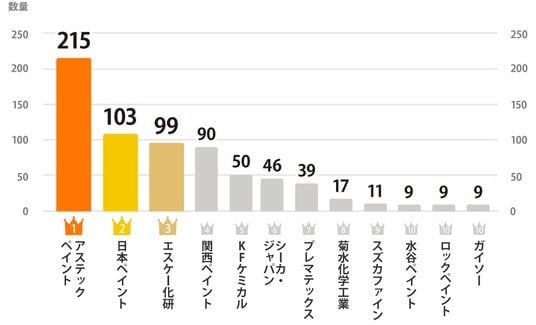 契約された塗料をメーカーごとに集計したシェアランキングです。