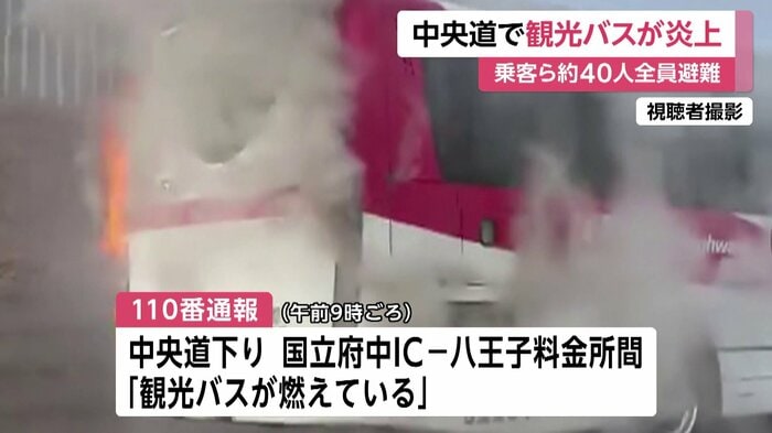 18日午前9時ごろ、中央道下りの国立府中インターチェンジと八王子料金所の間で「観光バスが燃えている」と、110番通報があった。