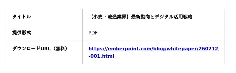 マーケティングプラットフォームを提供するエンバーポイント株式会社(本社:東京都千代田区、代表取締役:五十嵐 真人 以下、「エンバーポイント」)は、小売・流通業界の最新動向とデジタル活用をテーマにしたホワイトペーパー「【小売・流通業界】最新動向とデジタル活用戦略」を公開しました。