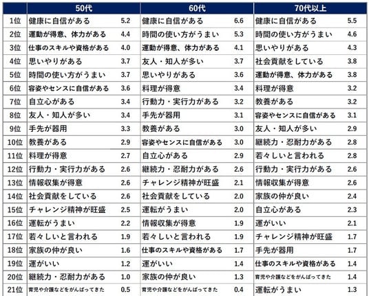 3位は「運動が得意、体力がある」。50代では2位、60代では3位、70代以上で5位だった。