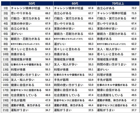 1位は「チャレンジ精神が旺盛」。50代・60代で1位、70代以上で2位だった。