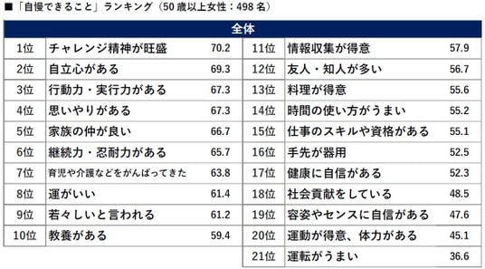 販売部数No.1(※1)雑誌「ハルメク」などのマーケティングやリサーチのコンサルティングを通じて、50代以上のインサイトを日々探求する「ハルメク 生きかた上手研究所」は、50歳以上の女性(事前調査524名、本調査498名)へのアンケート結果をもとにした「50歳からのハルメク世代に聞く なんでもランキング」を公開しました。テーマは「自慢できること」です。