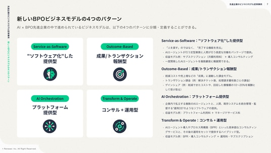 本スライド集では、BPO業界を取り巻くAI × BPOの市場動向を俯瞰したうえで、グローバルBPO大手のビジネスモデル変革事例と、コンタクトセンター・バックオフィス領域で急成長するAIネイティブなスタートアップ事例を収録しています。1. 「Service-as-Software(SaS)」など、4つの次世代ビジネスモデルを定義