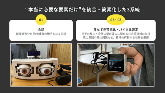 1.会話ロボット「HUSK T(ハスクティー)」:面接練習の相手として、対人不安をやわらげる