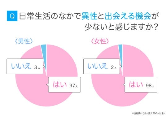 成人男女200人に「日常生活のなかで異性と出会える機会が少ないと感じますか?」と尋ねたところ、男性は97人、女性は98人が「はい」と回答しました。