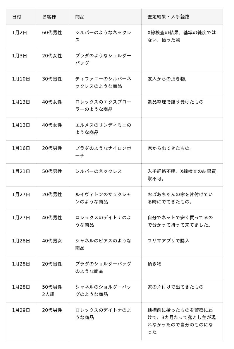 基準外品(偽物)のブランド品の持ち込みは1か月で13件ありました。