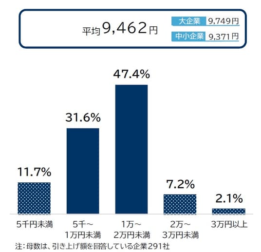 規模別にみると、「大企業」の平均引き上げ額は9,749円、「中小企業」は9,371円と、「大企業」が「中小企業」を400円近く上回った。