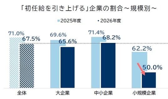 「初任給を引き上げる」と回答した企業の割合を規模別にみると、「大企業」(65.6%、前年度比4.0ポイント減)と「中小企業」(68.2%、同3.2ポイント減)はともに6割台後半だった。一方で、「小規模企業」は同12.2ポイント低下して50.0%にとどまり、全体と比べても17.5ポイント下回るなど、「小規模企業」が取り残される結果となった。