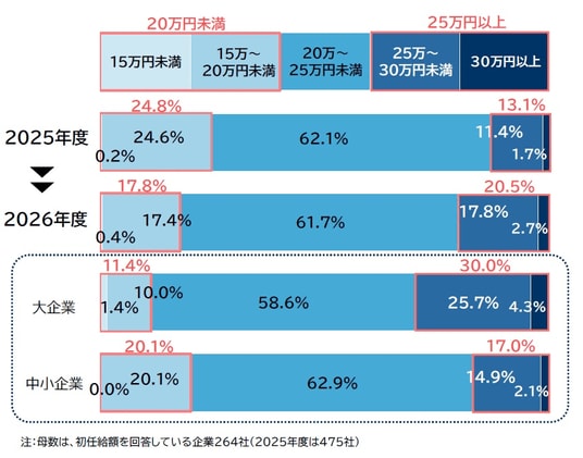 規模別にみると、「大企業」では『25万円以上』(「25万~30万円未満」と「30万円以上」の合計)が30.0%に達したのに対し、「中小企業」は17.0%にとどまり、企業規模による初任給水準の差が依然としてみられる。