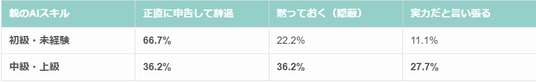 一方で、中級・上級のAI利用者では、「黙っておく」「実力として評価する」といった選択が大きく増加しました。