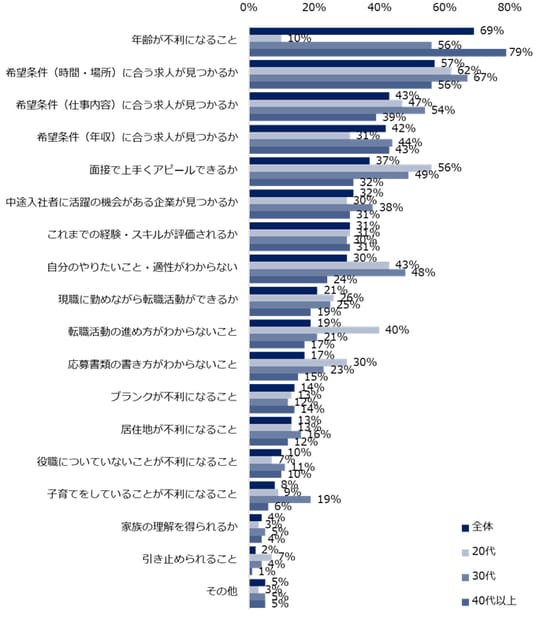 転職活動に不安を感じている方にどのような不安を感じているかを伺うと、上位は「年齢が不利になること」(69%)、「希望条件(時間・場所)に合う求人が見つかるか」(57%)、「希望条件(仕事内容)に合う求人が見つかるか」(43%)でした。年代別で見ると、20代のみ上位2位に「面接で上手くアピールできるか」(56%)があげられました。具体的な不安の声も紹介します。