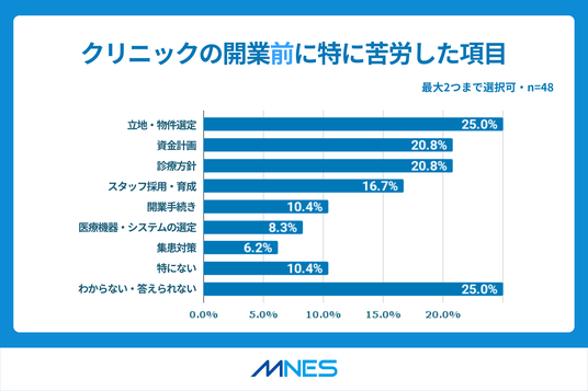 クリニックの開業前に、特に苦労した項目を質問したところ、「立地・物件選定」が最多の25.0%、次いで「診療方針」「資金調達」が同率の20.8%と回答する結果となりました。