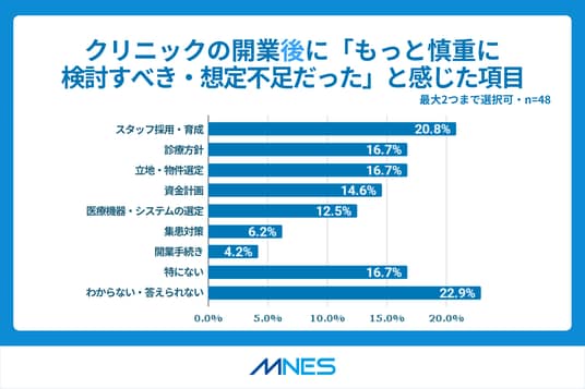 クリニックの開業後に、もっと慎重に検討すべきだった・想定不足だったと感じた項目を質問したところ、「スタッフ採用・育成」が最多の20.8%、次いで「診療方針」「立地・物件選定」の回答が16.7%と続きました。一方、「特にない」も16.7%の回答があり、自身のクリニック開業に対して満足している層も一定いることが明らかになりました。