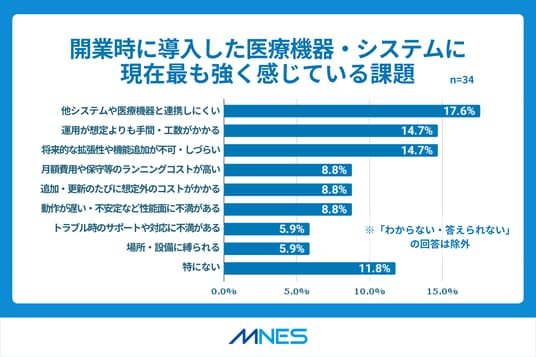 開業時に導入した医療機器・システムに対する課題として、現在最も強く感じているのは「他システムや医療機器と連携しにくい」が17.6%、次いで「運用効率」「拡張性」に関する項目