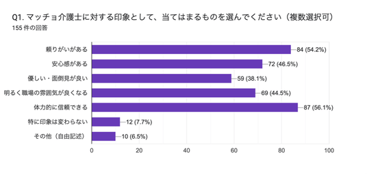 マッチョ介護士に対する印象についての問いにおいても、多くのスタッフから前向きな評価が寄せられ、現場の雰囲気づくりや安心感の向上、利用者とのコミュニケーション促進など、職場への良い影響が数値として表れるアンケート結果となりました。
