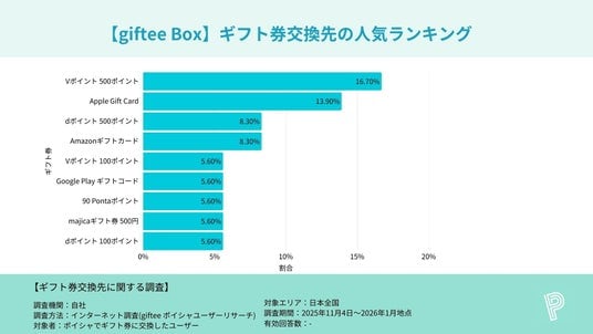 ・調査名 :ポイシャ ギフト券交換先 人気ランキング(アプリ内交換実績データ集計)