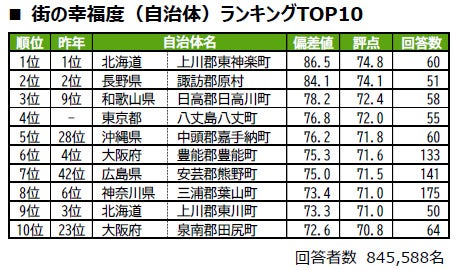 ●昨年は回答者数が50名未満で集計対象外だった長野県諏訪郡原村(22位タイ)、福井県南条郡南越前町(24位)、埼玉県秩父郡横瀬町(37位)、山形県西置賜郡白鷹町(46位)が新たにランクインしています。