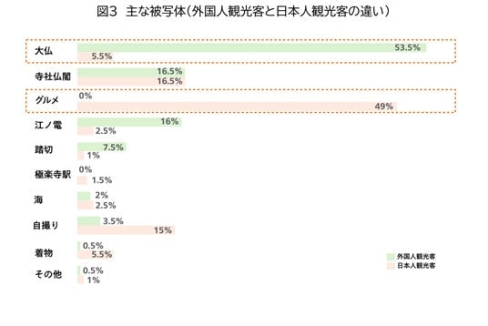 外国人では「大仏」が53.5%を占める一方、日本人において大仏は5.5%に留まりました。また、日本人で最も多かった「グルメ」の写真は全体の49%を占めていますが、外国人においては1枚も見られませんでした(図3)。