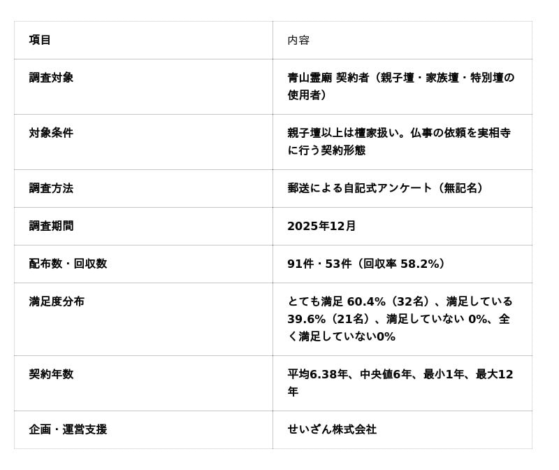 寺院の経営コンサルティング・運営支援を展開するせいざん株式会社(本社:東京都品川区、代表取締役:岩田 貴智、以下「せいざん」)は、運営を支援する実相寺青山霊廟(東京都港区)において、契約から数年以上が経過した利用者を対象とした満足度調査を実施いたしました。