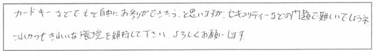 本調査のアンケート回答より:「カードキーなどを使って自由にお参りができたら良いと思うが、セキュリティーなどの問題で難しいだろうと考えている。これからもきれいな環境を維持してほしい。」