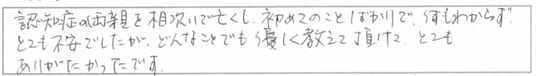 本調査のアンケート回答より:「認知症の両親を相次いで亡くし、初めてのことばかりで何もわからず、とても不安でしたが、どんなことでも優しく教えて頂けてとてもありがたかったです。」