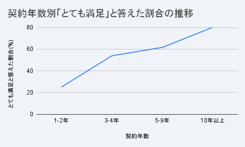 任意返送でも過半数が回答。利用者が声を届けたいと思える関係が維持されていることがうかがえます。3.契約10年以上の「とても満足」率が80.0%に到達
