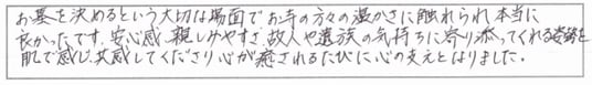 本調査のアンケート回答より:「墓じまいから契約まで親身な相談にて、心を込めて父を送れましたのは皆様のおかげです。とても感謝しております。北海道のお菓子を出してくださり(私達は北海道産まれです)懐かしく優しい時間を思い出し、お心遣いに感謝しました。」