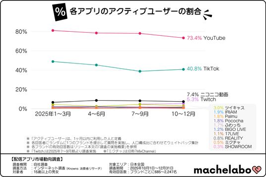特に『Twitch』は、前期(7~9月期)の10.6%から3.0ポイント数値を伸ばしており、利用者の広がりが確認できます。ゲーム実況やリアルタイムな交流に強みを持つ同サービスが、特定のファン層だけでなく、より広い層へと浸透しつつあるようです。