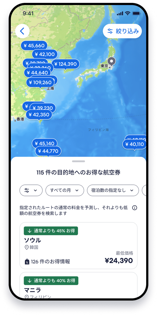 2026年2月より提供を開始したアプリ内新機能「フライトディール」では、出発空港を指定するだけで通常想定価格より20%以上お得な航空券を簡単に探すことができます。さらに、目的地別の航空券価格を地図上で比較できるマップ機能をはじめ、カスタマイズ可能なセール通知機能や、目的地・旅行日での絞り込み検索など、旅行計画に役立つ機能も充実しています。