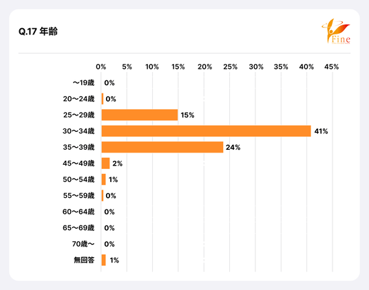回答者の性別は(Q14)、男性が3%、女性が96%。年齢(Q17)は20歳代が15%、30歳代が65%、