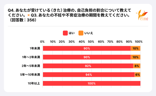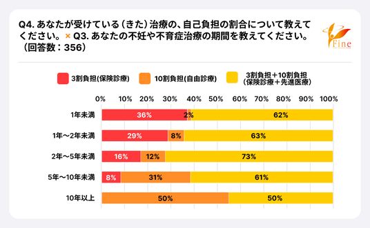 - 不妊や不育症の検査を受けたことがあるかの設問(Q2)で、「はい」と回答した356人に、受けている(きた)治療の、自己負担の割合を尋ねました(Q4)。「3割負担(保険診療)」は23%、「10割負担(自由診療)」は11%、「3割負担+10割負担(保険診療+先進医療)」は66%でした。<グラフ1>