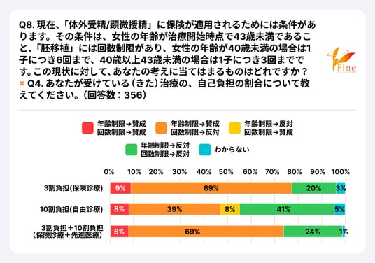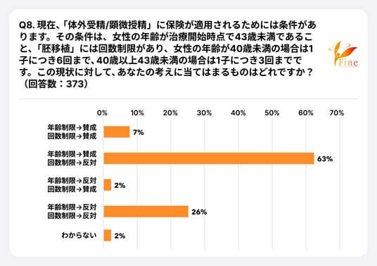 Q8. 現在、「体外受精/顕微授精」に保険が適用されるためには条件があります。その条件は、女性の年齢が治療開始時点で43歳未満であること、「胚移植」には回数制限があり、女性の年齢が40歳未満の場合は1子につき6回まで、40歳以上43歳未満の場合は1子につき3回までです。この現状に対して、あなたの考えに当てはまるものはどれですか?