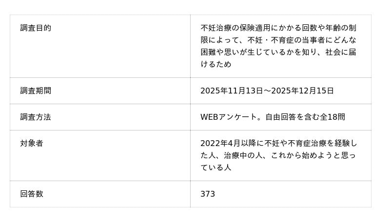不妊治療患者をはじめ不妊・不育症で悩む人をサポートする、セルフサポートグループ「NPO 法人 Fine (ファイン、以下、当法人)」は、「不妊治療の保険適用の条件緩和に関する緊急アンケート2025」を実施し、373人から回答を得ました。