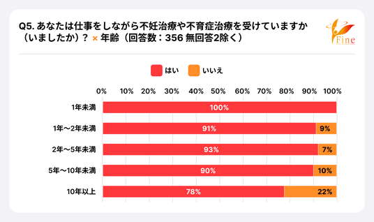 仕事をしながら不妊治療や不育症治療を受けている(いた)かの設問(Q5)で、91%が「はい」と回答しました。<グラフ12>